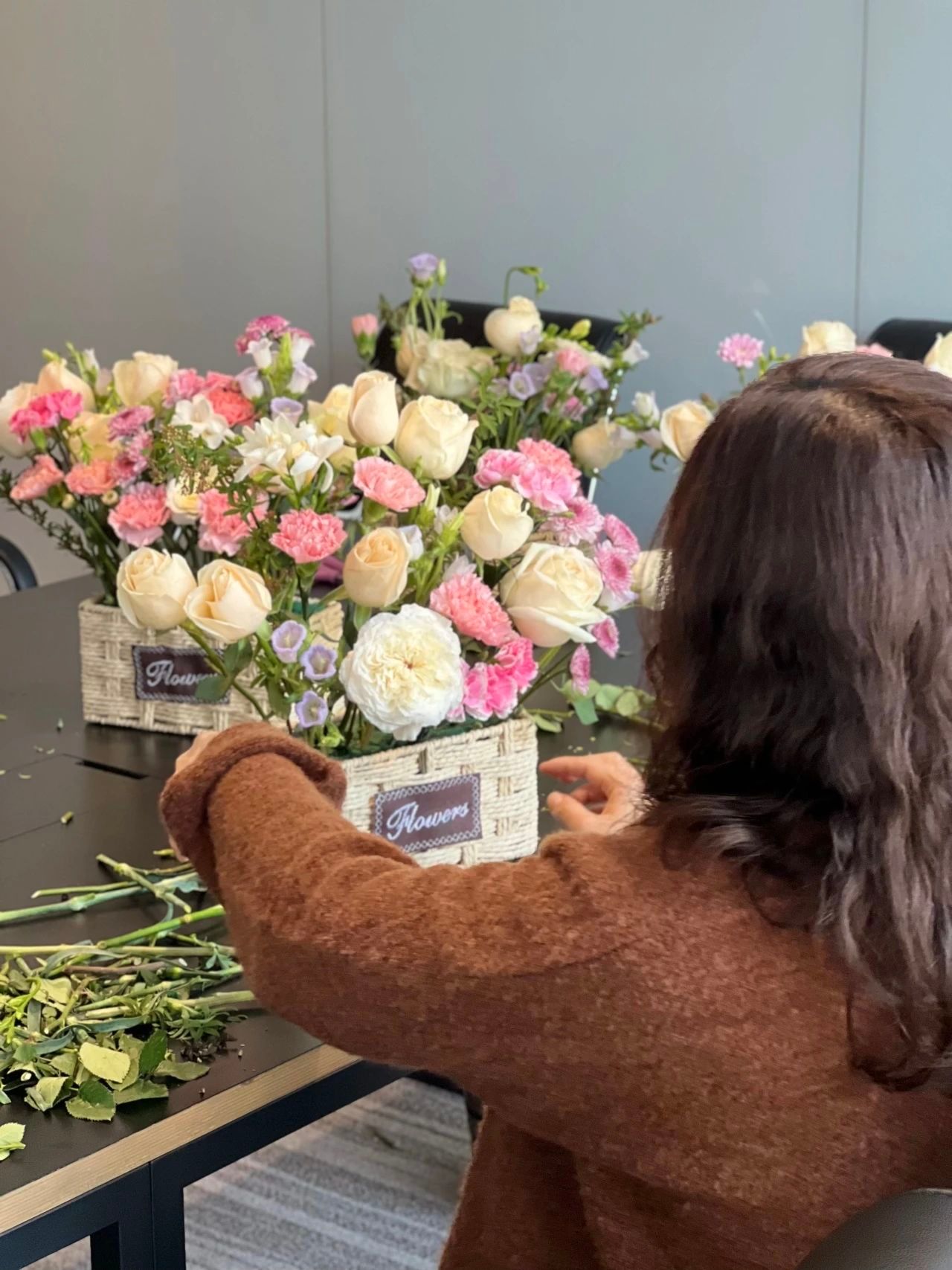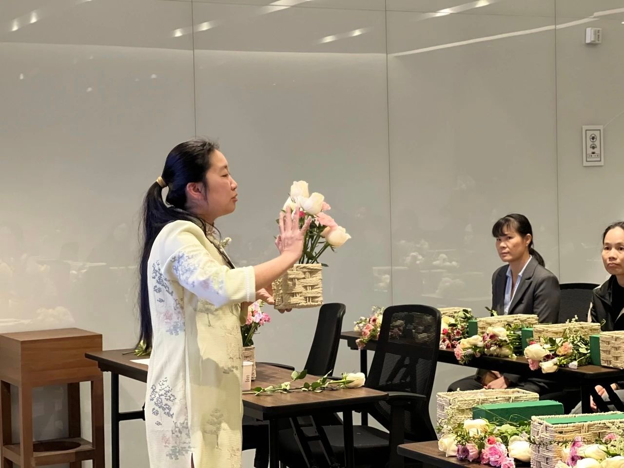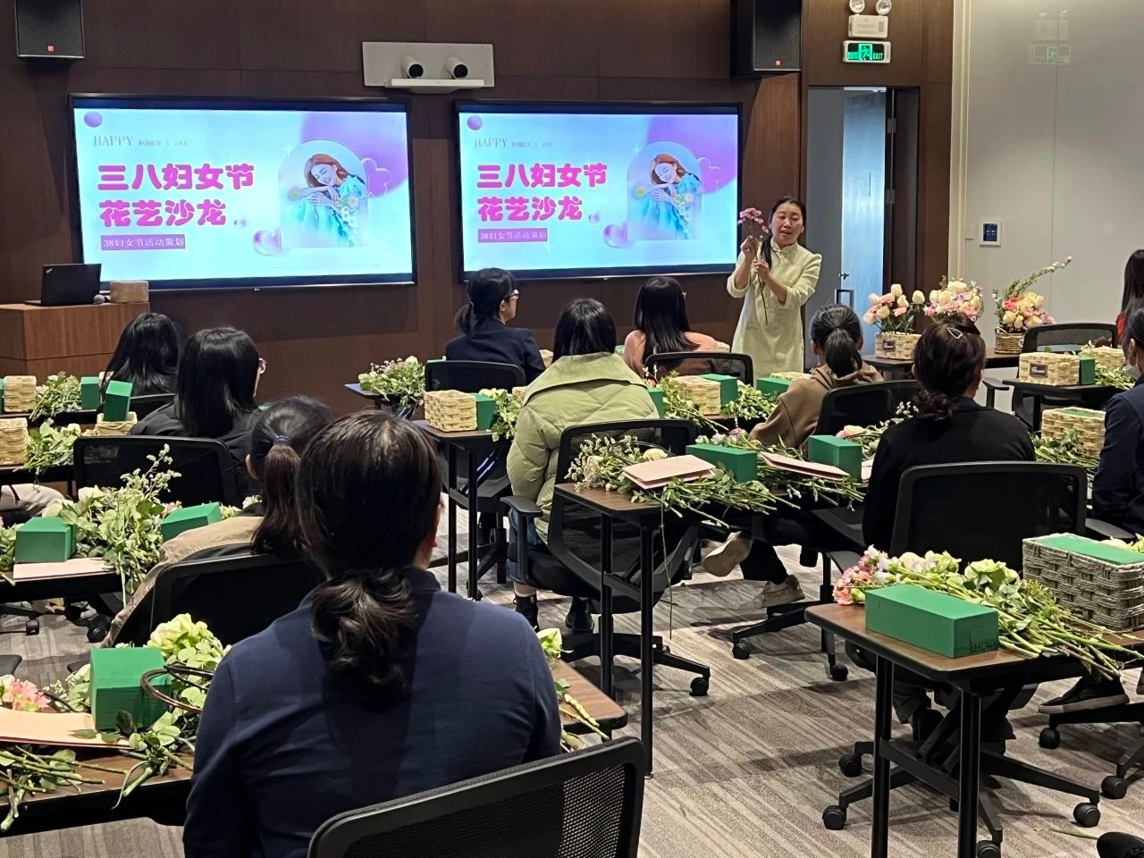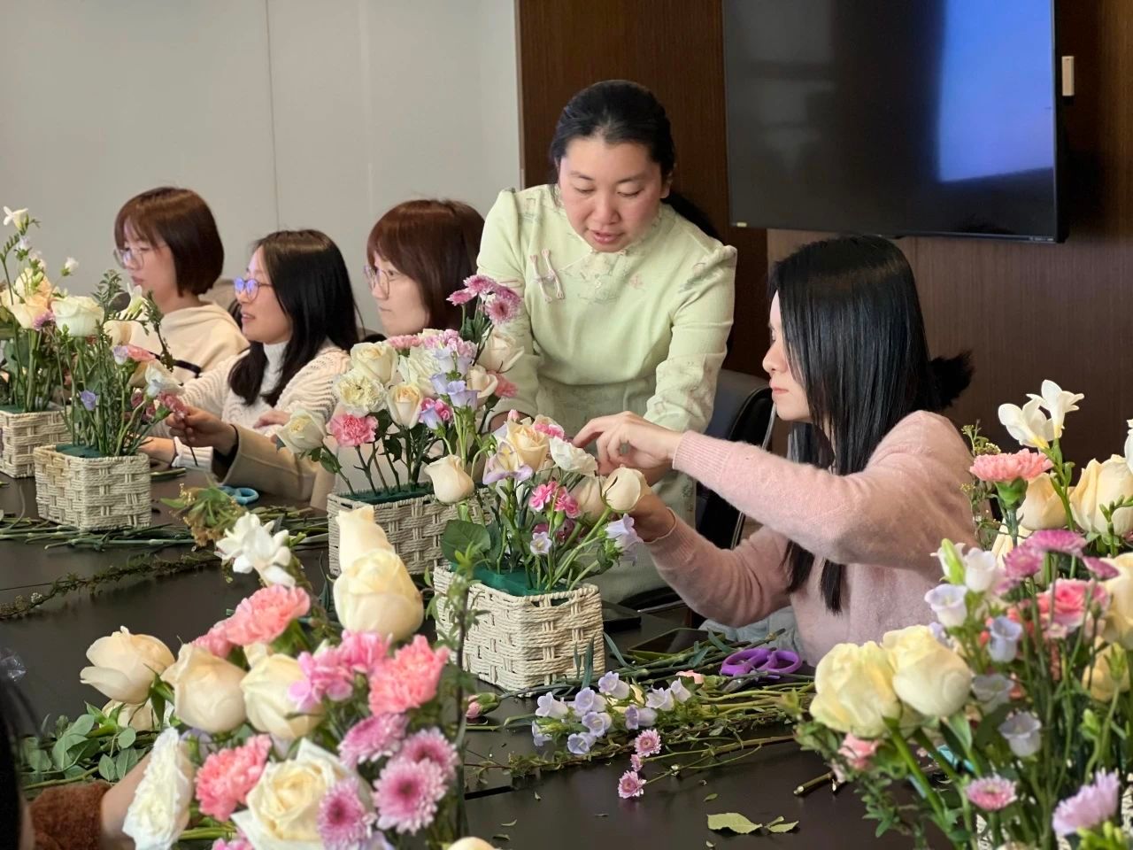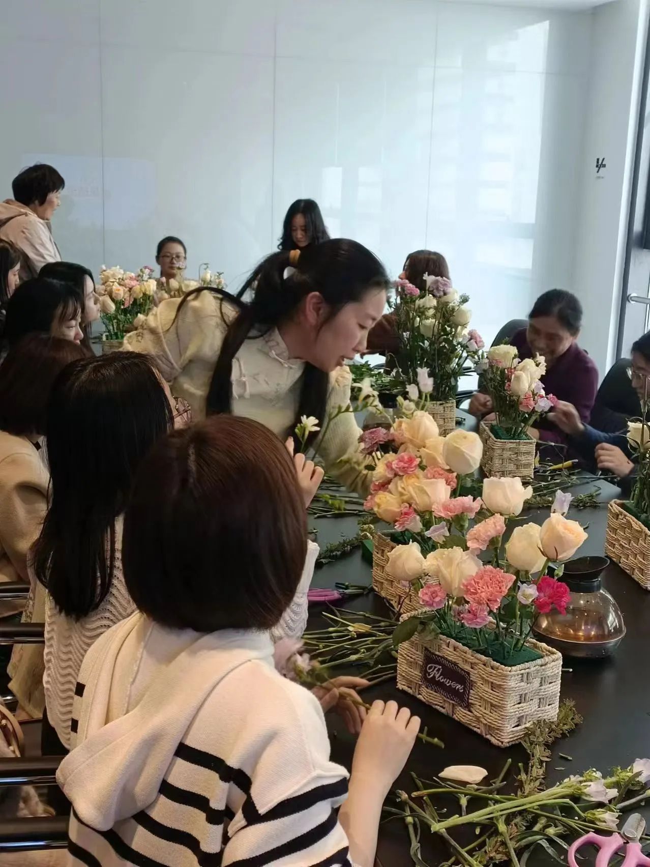 2024年3月08日,我们举办了妇女节插花活动。让广大女性教职工共同感受这份春日的美好。活动开始前,我们精心准备了插花活动需要的花材、花泥、以及花篮,并且邀请了专业的花艺老师前来为广大女性职工,讲解插花的步骤。活动开始时,花艺老师在台上亲自示范插花步骤,并且向大家讲解插花的知识以及养花的细节,大家在老师的讲解下,学习得十分投入。遇到不知道怎么搭配花材的时候,便向老师请教,最后当自己成功完成这份插花时,大家脸上都洋溢着喜悦的笑容。
